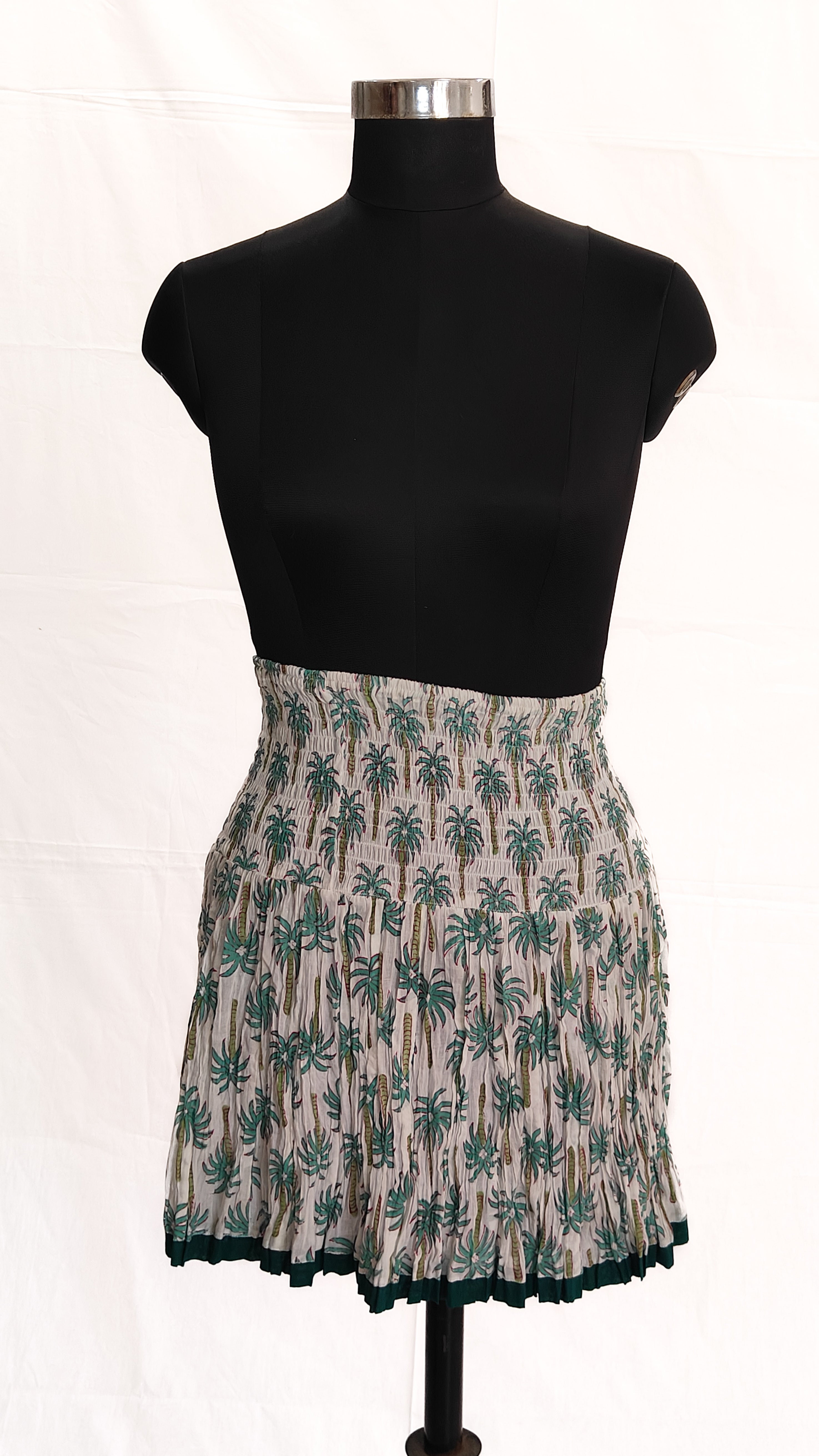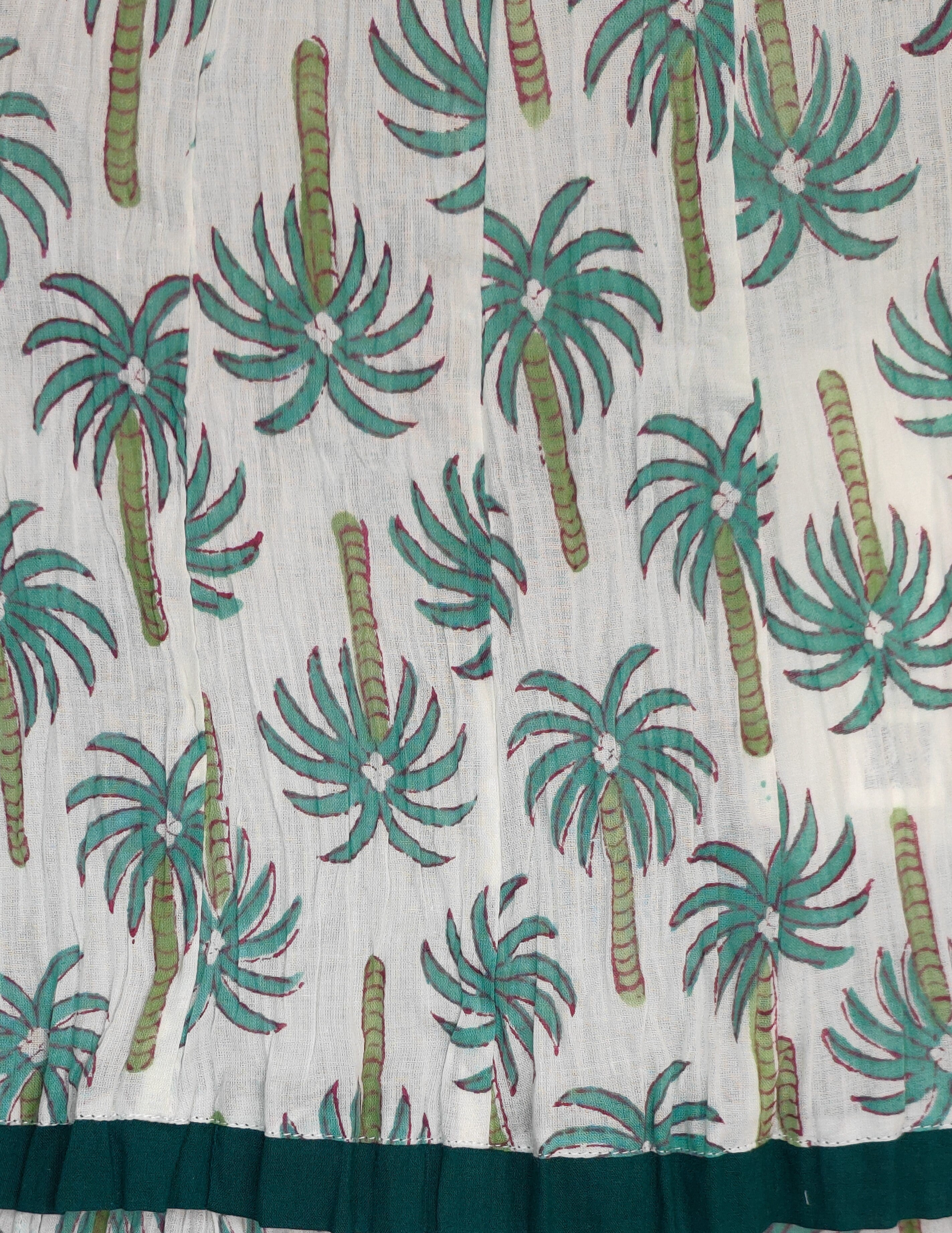 Effortless, breezy and playful—our Coconut Groove is a handblock printed piece that beautifully transforms from a smocked top to a flirty beach skirt.Crafted from 100% Mal cotton, it features a delicate off-white base printed with lush green palm motifs, hand-stamped using traditional block techniques.